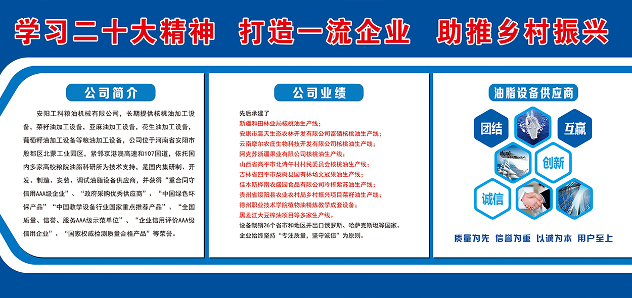 安陽工科糧油機械有限公司,長期提供核桃油加工設備,茶籽油加工設備,菜籽油加工設備,亞麻油加工設備,花生油加工設備,葡萄籽油加工設備等糧油加工設備,公司位于河南省安陽市殷都區北蒙工業園區,緊鄰京港澳高速和107國道,依托國內多家高校糧院油脂科研所為技術支持,是國內集研制、開發、制造、安裝、調試油脂設備供應商,并獲得“重合同守信用AAA級企業”、“政府采購優秀供應商”、“中國綠色環保產品”“中國教學設備行業國家重點推薦產品”、“全國質量、信譽、服務AAA級示范單位”、“企業信用評價AAA級信用企業”、“國家權威檢測質量合格產品”等榮譽。先后承建了新疆和田林業...